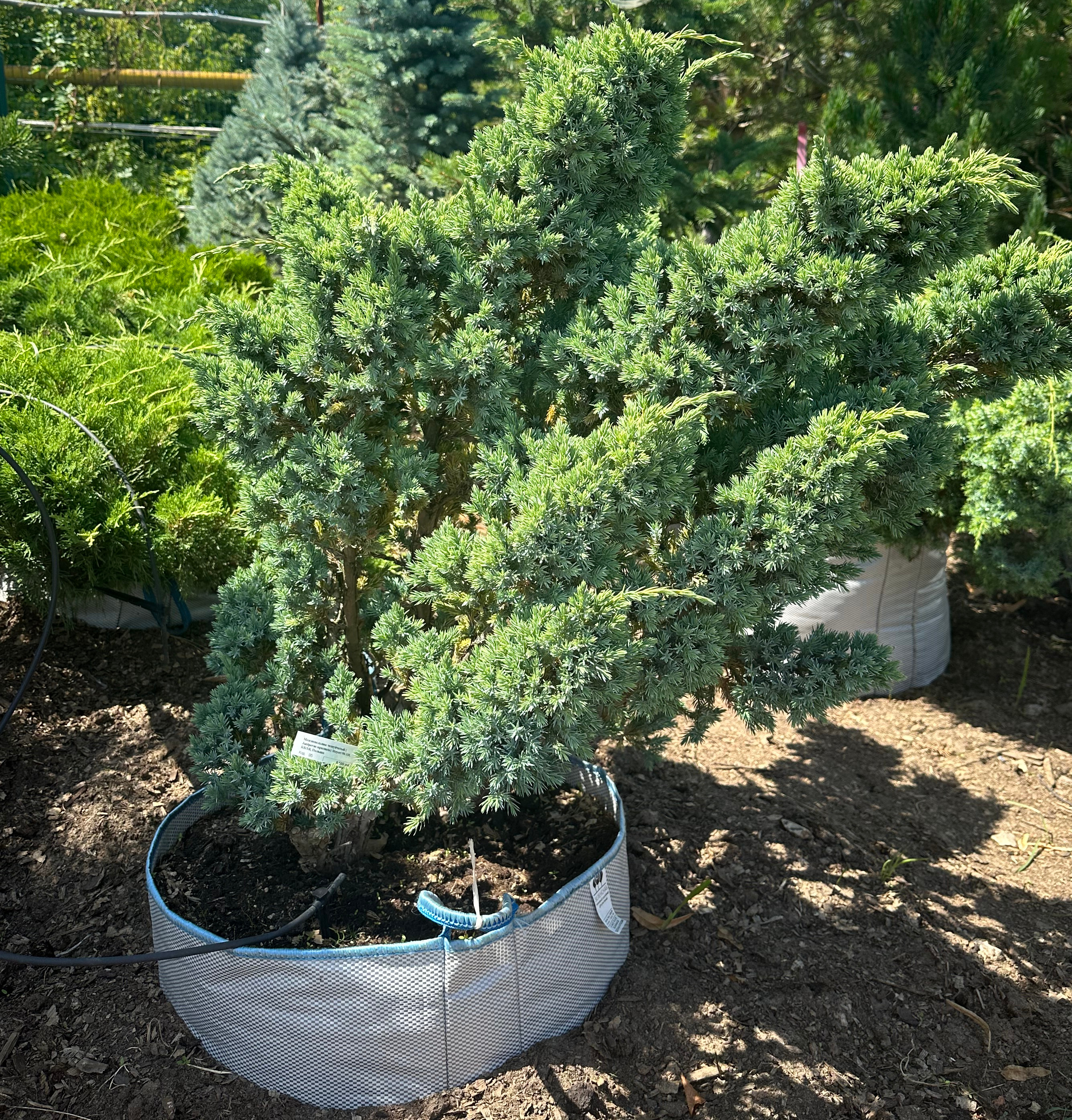 Кустарник средней высоты с прямостоячими побегами, которые на концах изгибаются вниз, образуя воронку. Хвоя имеет серебристо-голубой оттенок и отличается густотой.