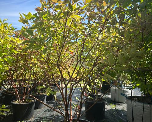 Кустарник привлекает внимание своей раскидистой кроной, которая состоит из тёмно-фиолетовых побегов с тёмно-зелёными листьями, имеющими красноватый оттенок.